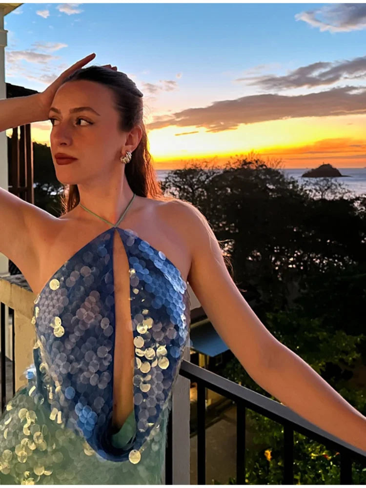 Meet The Thalassa Mirage — a dazzling, ocean-hued fantasy inspired by the Greek primordial goddess of the sea. This mini dress catches every glimmer of light with oversized iridescent sequins in cascading shades of aqua and sapphire, like waves at golden hour.