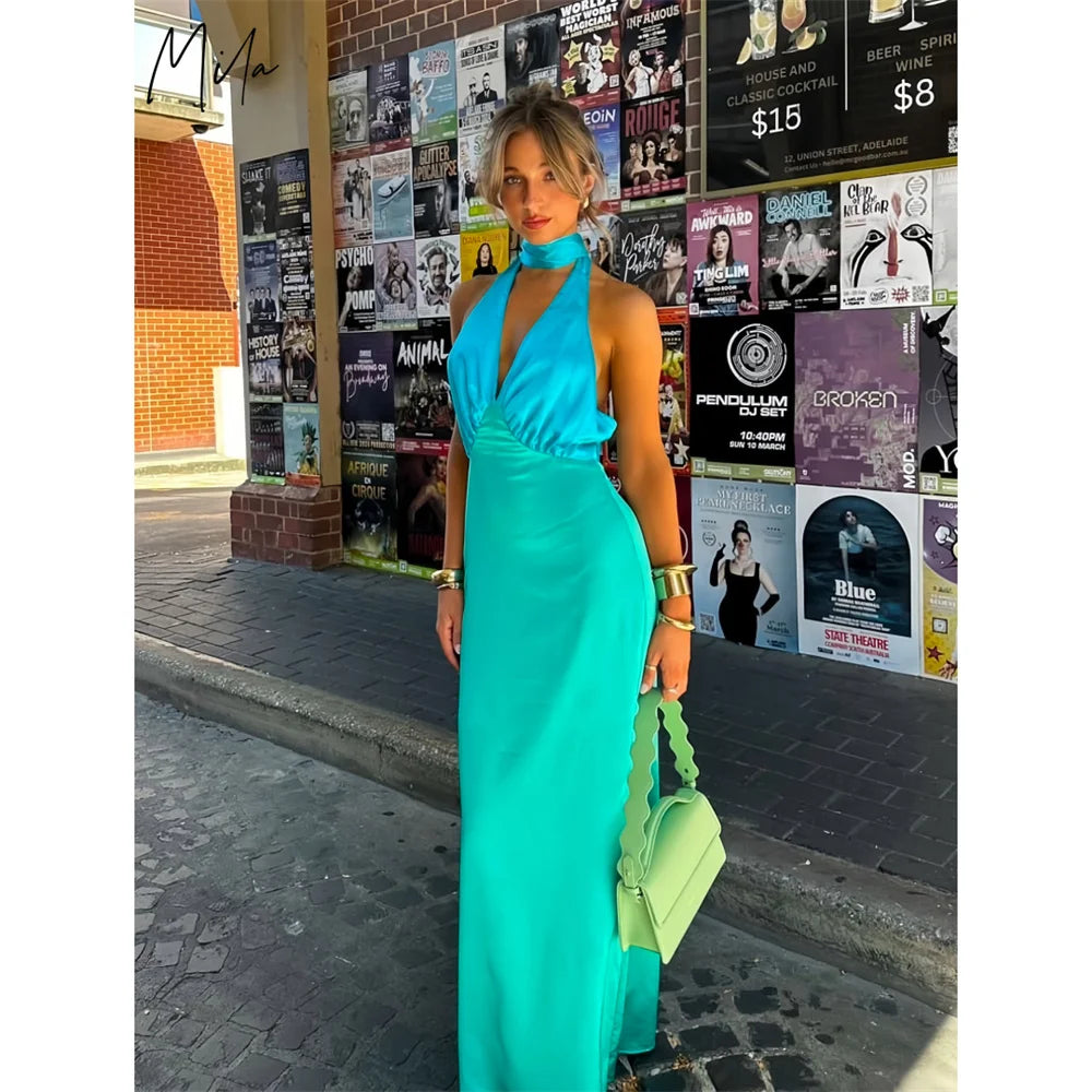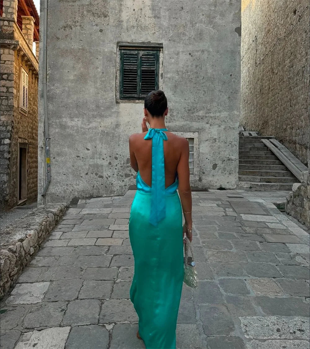 Unleash your inner goddess with the Isla Satin Maxi β a fluid vision of coastal glamour. With its lustrous ocean-blue satin, plunging halter neckline, and open-back tie, this dress moves like water and shimmers with every step. A dreamy silhouette for sultry summer nights.