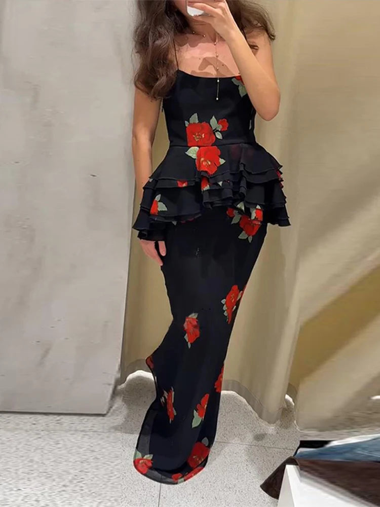 Unleash your inner goddess with the Rosa Noir Maxi — a romantic silhouette with a touch of drama. This sculpted two-piece look features a fitted corset bodice, double peplum ruffle, and bold red rose print that speaks volumes. Elegant yet daring, it’s designed to captivate.