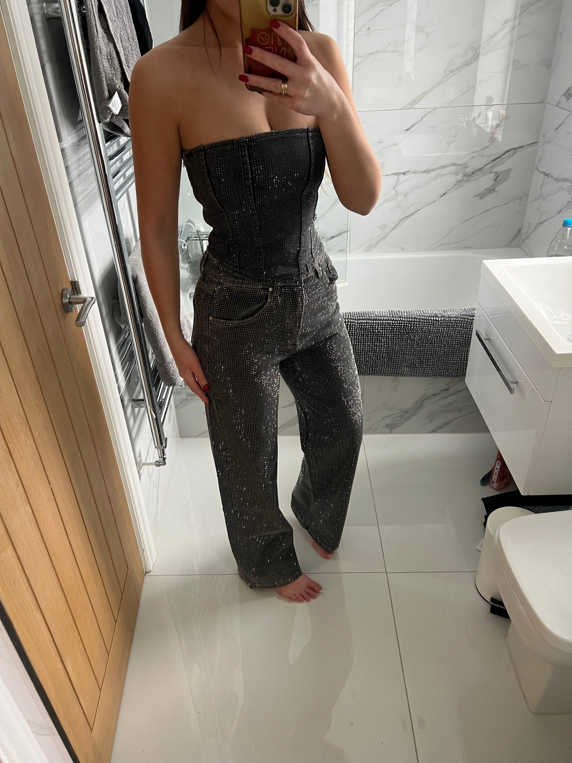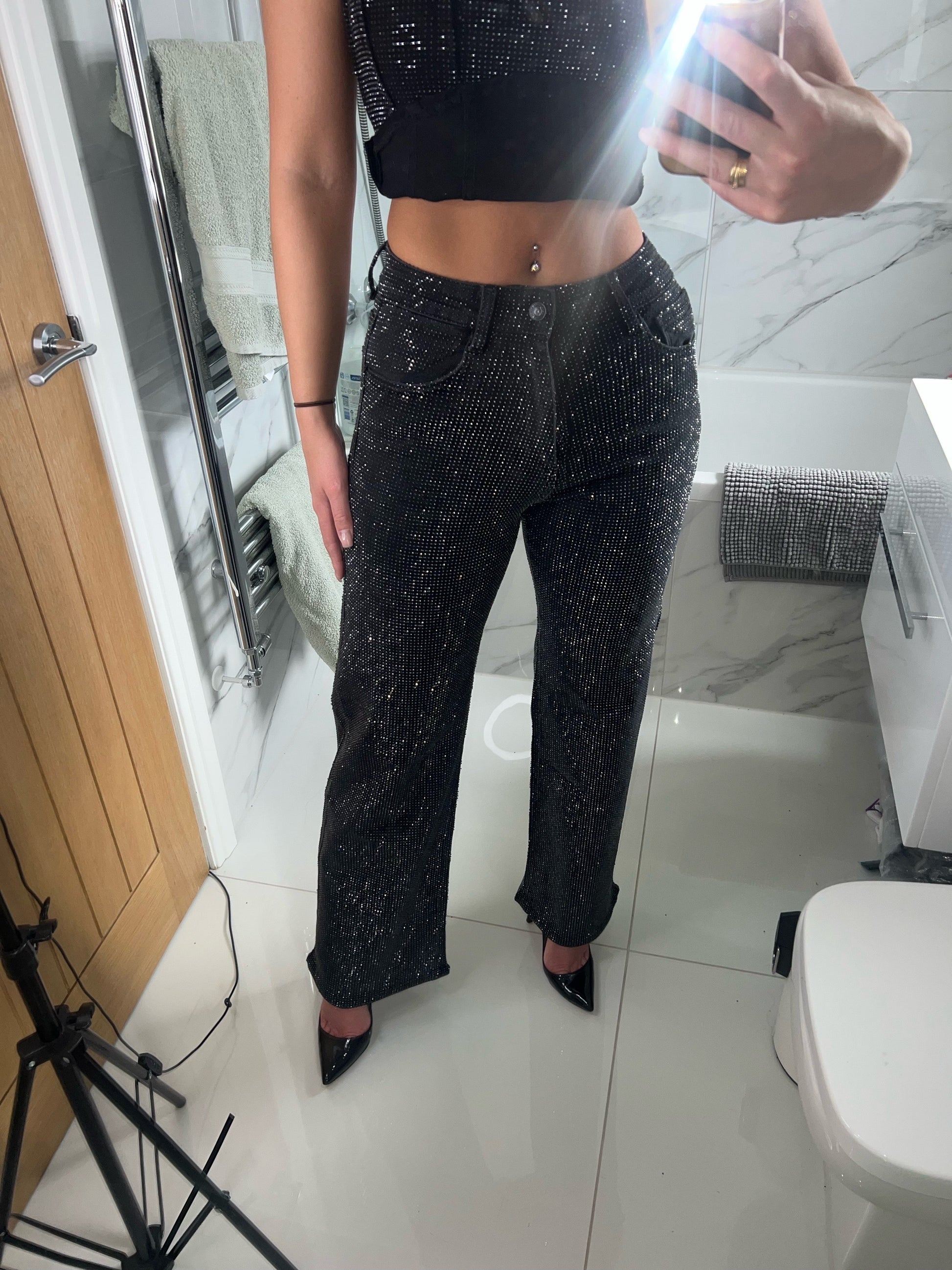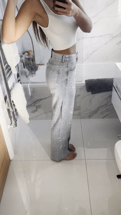Step into the spotlight with our Silver Diamanté Wide Leg Jeans, the ultimate statement piece for a bold, glamorous look. Designed with a flattering high-waisted fit and a relaxed wide-leg silhouette, these jeans effortlessly blend comfort and style.