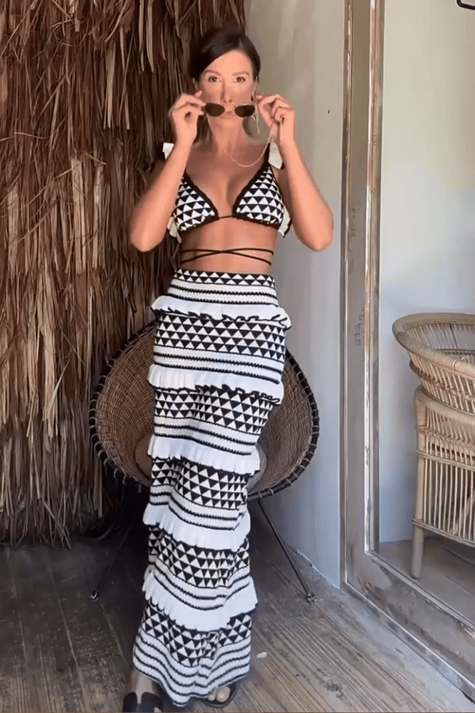 Introducing the VICTORIA 2 Piece Contrast Set, your new go-to for nights filled with fun and flair! This set includes a flirty ruffled maxi skirt and a matching bralette that's as chic as it is comfy. Whether you're hitting the town or catching up over drinks with your crew, the Victoria set promises to turn heads with its playful ruffles and flattering fit. Perfectly crafted for dancing or lounging, it's designed to keep you feeling fabulous all night long! ✨